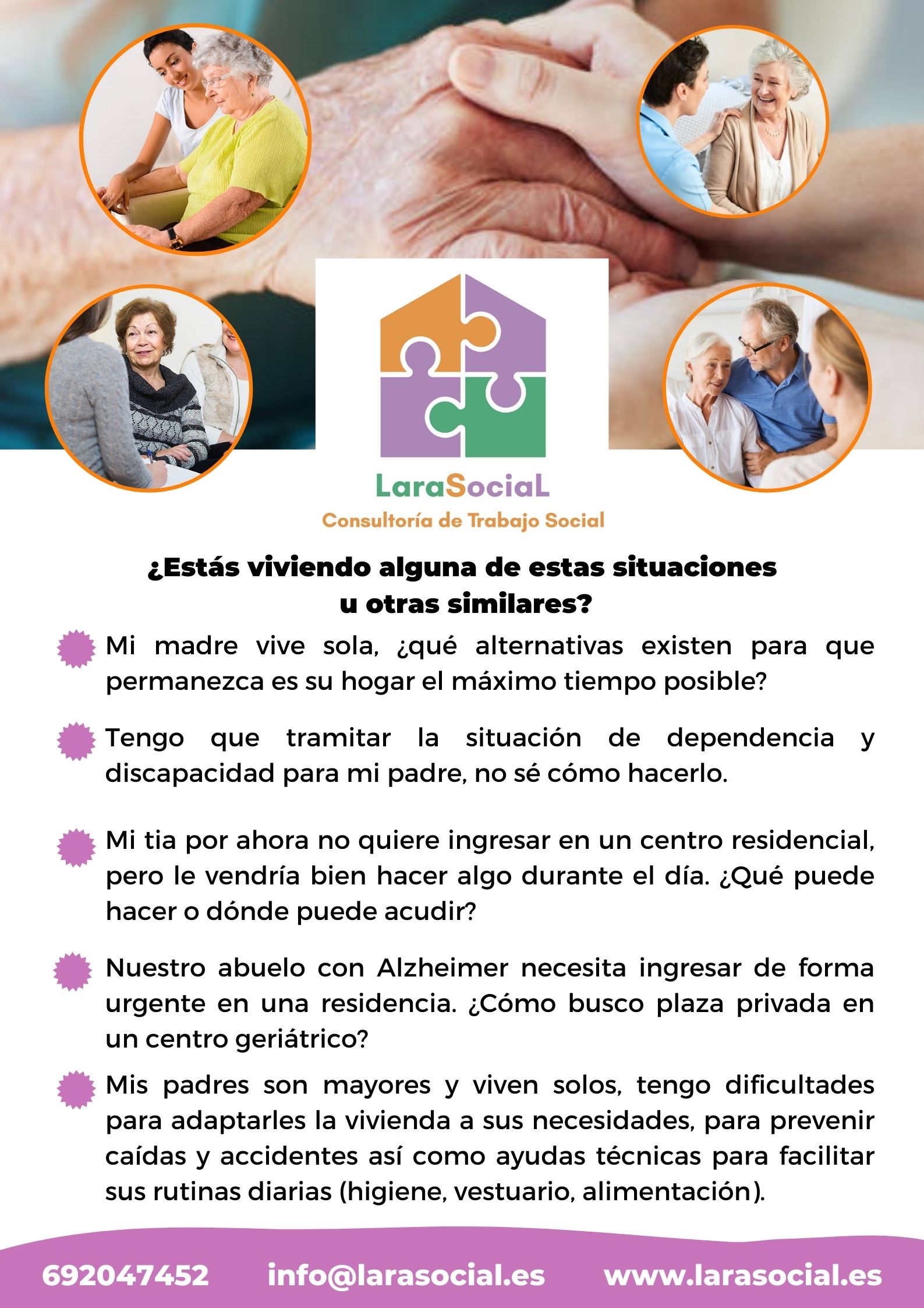 Leer másLaraSociaL Consultoría de trabajo Social, es una consultoría privada de Trabajo Social para personas mayores con o sin dependencia y cuidadores familiares. Asesora y orienta sobre los servicios, recursos y prestaciones con las que afrontar las situaciones de dependencia